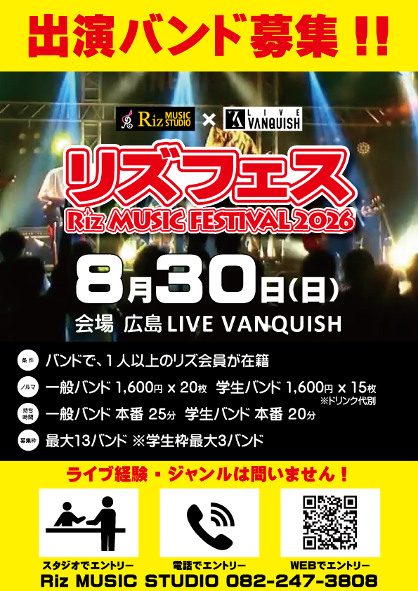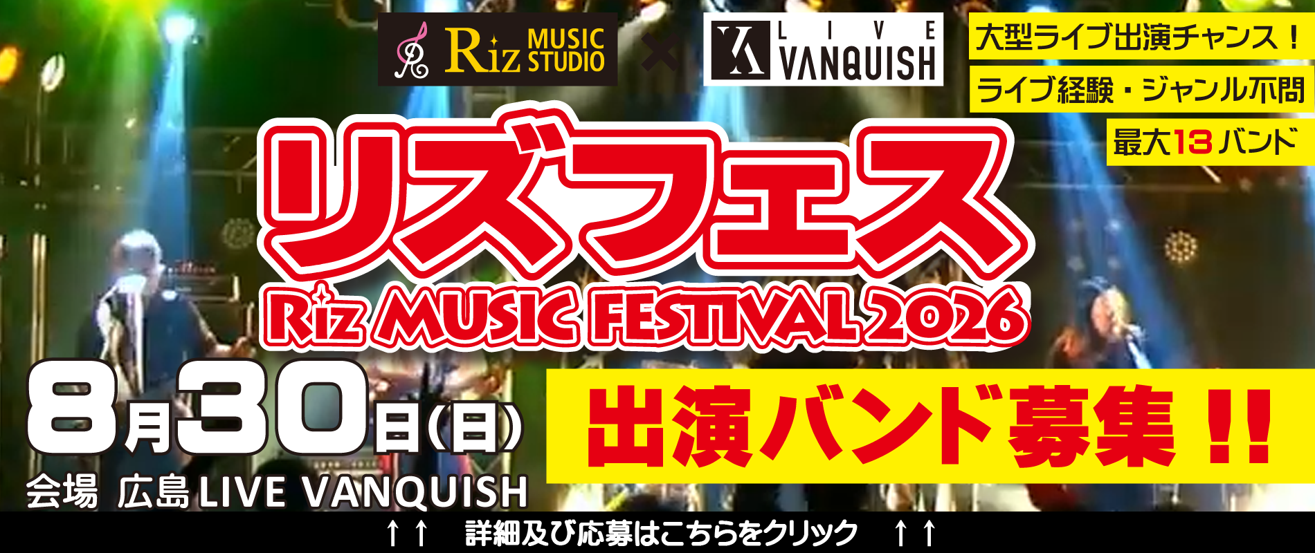 スタジオのWEB予約はこちら お知らせ 2026年3月2日2026年3月2日 今年もリズフェス2026の出演バンドを募集いたします! 2026年2月1日2026年2月1日 2026年2月23日(月祝) スタジオ主催の『Riz MUSIC SHOW vol.7』 2025年12月7日2025年12月7日 年末年始の営業についてのお知らせです。 おすすめプラン STUDIO スタジオ毎に入室開始時間があります。 大人数に対応したスタジオ!!0分、30分 Live MOON [17畳]0分 A-1 [12畳]0分 B-1 [12畳]30分 B-2 [12畳]0分 B-3 [9畳]30分 C-1 [3畳]0分&30分 Booth1 [7畳]0分&30分 Booth2 ストックルーム大型・小物用コンテナもございます。 レコーディングルーム 駐車場1F立体駐車場の入口から専用エレベーターで直結!!大切な機材が雨でも濡れないから安心。ウェイティングスペースお待ちの時や練習の合間などで、くつろげるウェイティングスペースがあります。ストックルーム大型機材を毎回リハーサルやライブに持ち運ぶのは大変・・・ Rizではそんな大型機材をお預かりするストックルームを完備!!! 広島市内中心地にあるスタジオですのでライブハウスへの持ち運びも便利に!!! キックペダル・スティック・エフェクターボードなどの小物用コンテナもご用意しております。